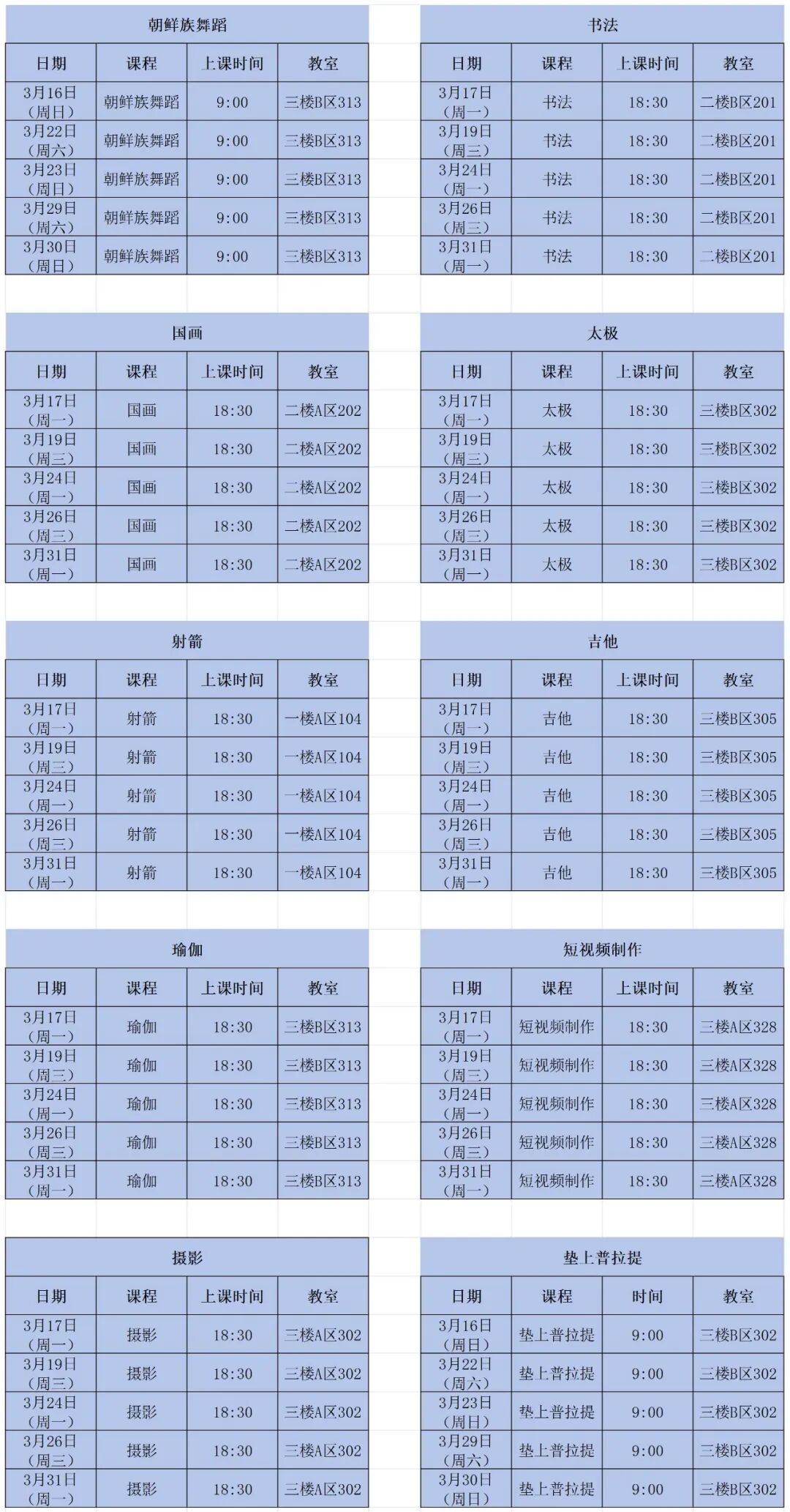 自3月17日开始,至3月31日止,基础课:每门专业每期5节课,夜校上课时间为周一、周三18:00-19:30;周末课:每门专业每期5节课,周六、周日9:00-10:30,遇节假日顺延(附课程表)。