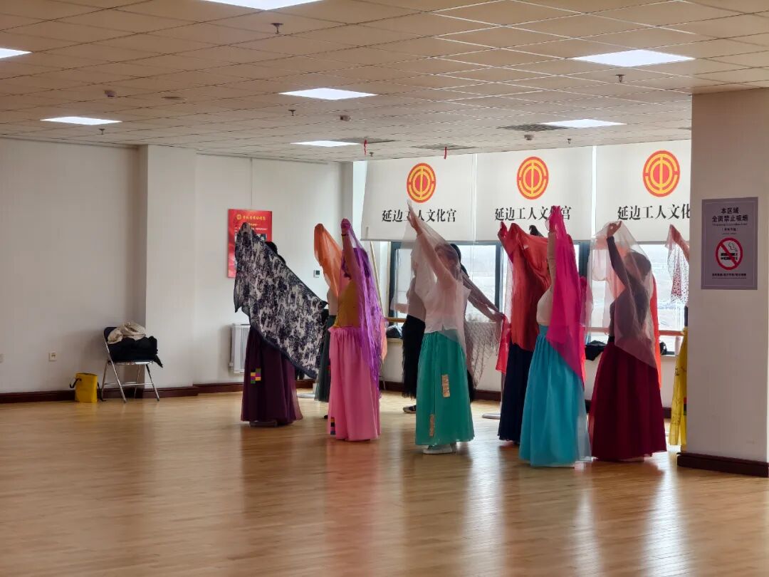 在朝鲜族舞蹈的教室内,悠扬的朝鲜族音乐回荡其中。授课老师与职工学员们身着鲜艳的朝鲜族传统服饰,身姿轻盈优美,舞步灵动活泼。