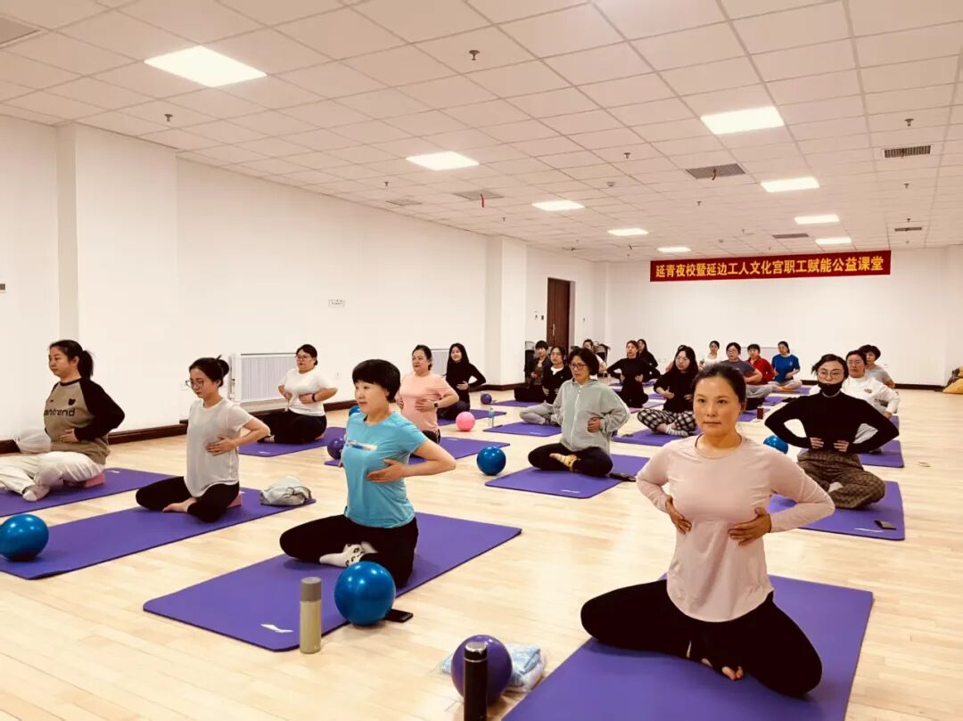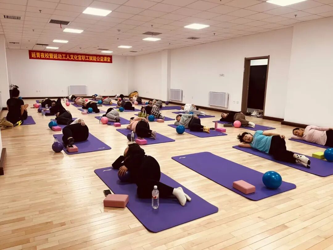 而在垫上普拉提的教室里,则是另一番景象。职工学员们平躺在专业的普拉提垫上,专注地跟随老师的指导进行各种体式的练习。
