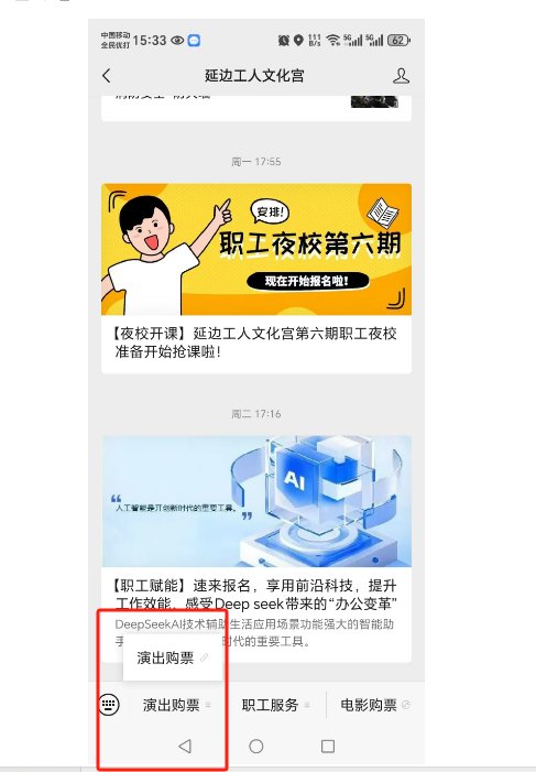 关注延边工人文化宫公众号-发消息-底部菜单-演出购票即可