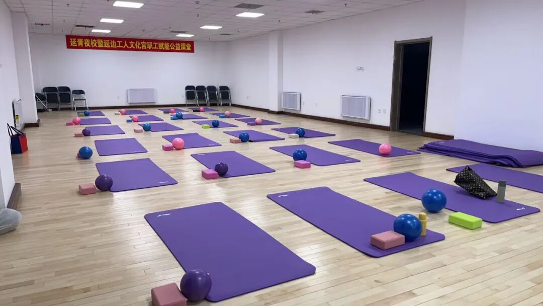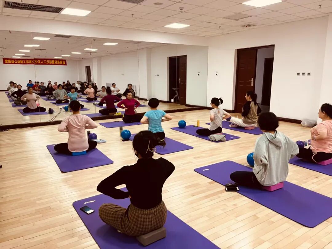 而在垫上普拉提的教室里,则是另一番景象。职工学员们平躺在专业的普拉提垫上,专注地跟随老师的指导进行各种体式的练习。