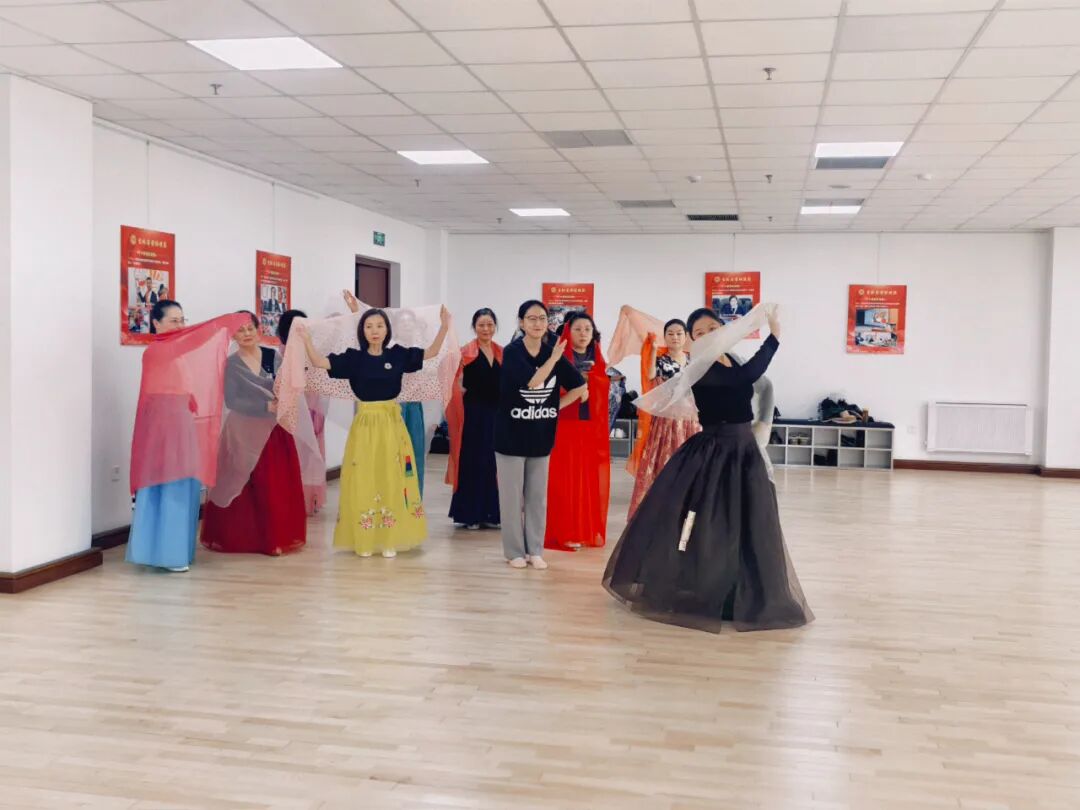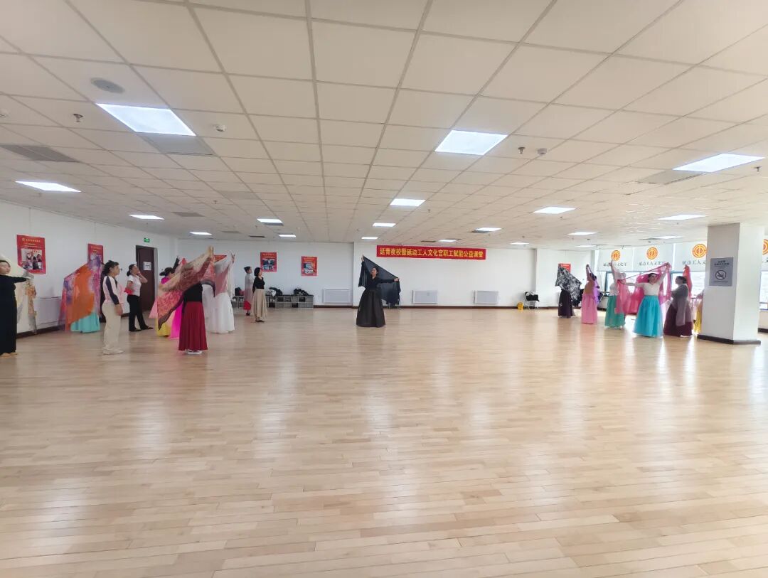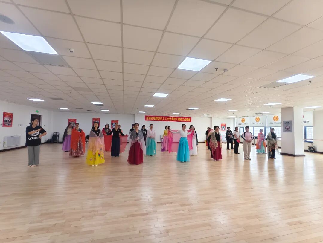 在朝鲜族舞蹈的教室内,悠扬的朝鲜族音乐回荡其中。授课老师与职工学员们身着鲜艳的朝鲜族传统服饰,身姿轻盈优美,舞步灵动活泼。